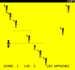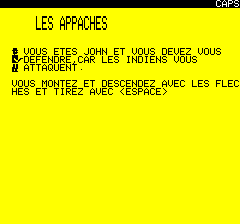 | No author mentioned in the magazine for this listing. It was published in the french magazine TILT n°20 (April 1985). In the Far West the apachees are on the warpath. You must escape them. Use arrows to move and SPACE to shoot. |