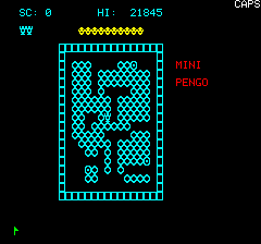 | No author mentioned in the magazine for this listing. It was published in the french magazine TILT n°15 under the name PENGORIC (but in the game the name MINI PENGO appears !). You are PENGO the Penguin and you must trap you 3 enemies by pushing the icecubes. Use A(up), K(left), Z(down) and L(right) to move and SPACE to push the blocks. |